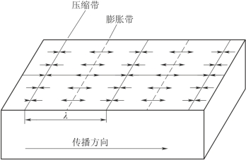 弹性介质发生体应变产生的波动称为纵波。介质压缩时质点彼此靠近,形成压缩带,膨胀时质点彼此疏远,形成膨胀带,波的传播就由压缩带和膨胀带的序列所组成,如图5-2所示。因此,纵波又称为疏密波和压缩波。纵波的传播具有下列特征: