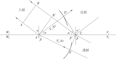 当地震波以某个入射角α射到介质分界面时,它的一部分能量经界面反射,以α'角(反射角)出射形成反射波,另一部分能量则透过界面,以β角折射至下一个岩层,形成透射波,β称为折射角,如图5-9所示。