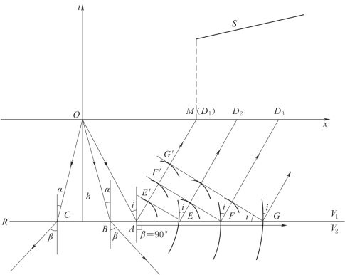 由式(5-13)可知,当V1>V2时,α>β,透射波射线靠近法线偏折;当V1<V2时,β>α,透射波射线远离法线,而向界面靠拢;在多层介质中,假定速度是递增的,透射波射线则是一条折线。