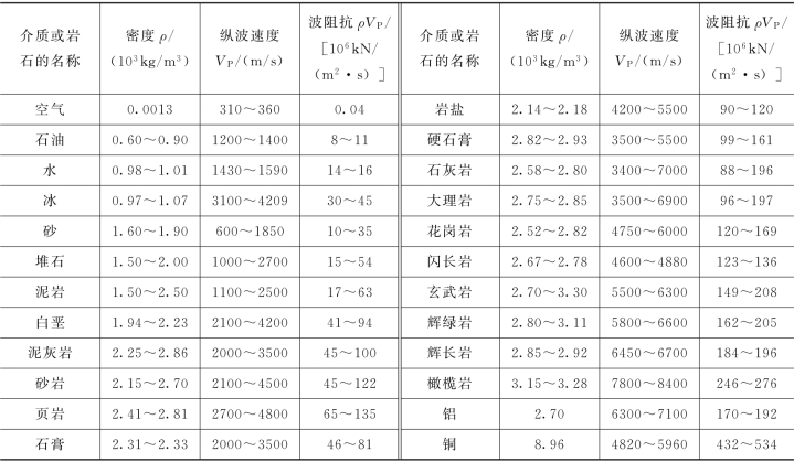 表5-1 介质与岩石的密度、纵波速度和波阻抗
