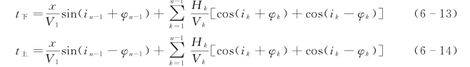 式中:x为炮检距;Vk为各层波速;Hk为相应各层的垂直厚度(Hk=hk/cosφk);ik为射线在各层界面的入射角;φk为各层界面的倾角,如图6-9所示。