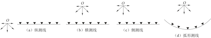 测线的类型有多种,如图6-24所示。当激发点和接收点在一条直线上时称为纵测线,如图6-24(a)所示。当激发点和接收点不在一直线上时称非纵测线,图6-24(b)所示称为横测线,图6-24(c)所示称为侧测线,图6-24(d)所示称为弧形测线。实际工作中以纵测线为主,非纵测线作为辅助测线或在特殊条件时应用。