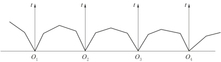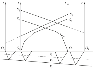 (4)双重相遇时距曲线观测系统。这种系统是把相遇观测系统和追逐观测系统结合在一起的观测系统。它适用于地表条件复杂的工区,如图6-27所示。一般在先完成相遇时距曲线S1、S2观测之后,再分别在O1、O2两侧对称地移动一定距离,进行追逐时距曲线S3、S4的观测。利用S3与S1、S4与S2的平行性,可以增加解释界面的长度。当然,此方法增加了野外工作量。