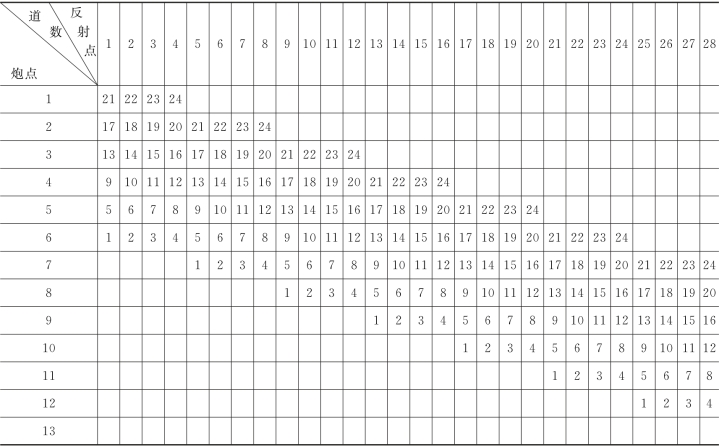 至于12次覆盖、96次覆盖等情况与此类似。野外施工中,每放一炮,排列和炮点向前移动的道数为NS/(2n),其中,N为排列中的接收到数,n是覆盖次数,当单边放炮时,S=1,当双边放炮时,S=2。例如,24道接收、三次覆盖、单边放炮时,放完一炮后,炮点的排列向前移动4个道间距;若十二次覆盖,则移动1个道间距。