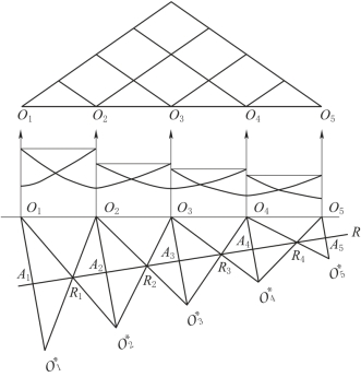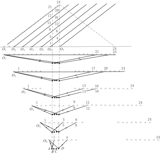 下面以单边放炮24道接收的六次覆盖为例说明多次覆盖观测系统。如图6-31所示,炮点位于排列的一端,偏移距(炮点与最近道的距离)为一个道间距。每放完一炮,炮点和接收点一起向前移动两个道间距,这样便组成一个六次覆盖的观测系统。将所有的炮点O1、O2、O3…标在同一水平线上,然后从各炮点向排列前进方向作一条与炮点成45°角的直线,将同一排列上的24道分别投影在这些45°的斜线上。即每一根斜线表示一个排列,获得一张原始记录。从图6-31中可以看出,O1炮的第21道、O2炮的第17道、O3炮的第13道、O4炮的第9道、O5炮的第5道、O6炮的第1道,都接收来自A点的反射。因此,分别在这六张记录上选出的第21道、第17道、第13道、第9道、第5道和第1道就是公共反射点A的共反射点道集。其他的反射点也可以找到相应的共反射点道集。从图6-31可以看出,炮点连线和共反射点叠加道的连线是垂直的,其交点就是共反射点在地面上的投影位置。另外可以看到O1、O2、O3、O4、O5、O6六炮只能获得六次覆盖的四个共反射点A、B、C、D,若继续放O7、O8、O9、O10、O11、O12,则可以获得另外一张连续的六次覆盖剖面,他们的共反射点的相应叠加道见表6-1。显然,自A点以后,每一个反射点的信号可以在六张相应的记录上找到,这就是单边放炮的六次覆盖系统。