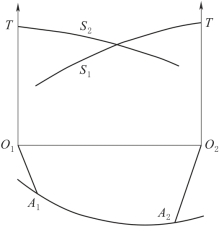 (2)相遇时距曲线观测系统。该系统具体形式见图6-26。当在测线的一端O1点激发震源时,可在A1O2间追踪折射波,并可得到时距曲线S1;当在测线的另一端O2点激发震源时,可在A2O1间追踪折射波,得到时距曲线S2。S1和S2这一对时距曲线称为相遇时距曲线。这一对相遇时距曲线满足互换关系。相遇时距曲线,对于解释地质条件复杂、界面起伏较大的情况较适用,故现被广泛应用。