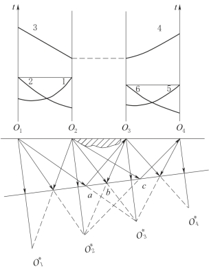 (2)延长时距系统。当测线通过河流、沼泽和居民点时,不能设置激发点和接收点,为了能连续追踪反射界面,可采用延长时距曲线系统进行观测。延长时距系统的吋距平面图如图6-29所示。假设在O2O3之间有河流通过,不能布置排列。为了获得O2O3下面的反射界面,可在O2点激发,在O3O4之间接收,得到时距曲线4,对应的反射界面为bc。又在O3点激发,在O1O2之间接收,得到时距曲线3,对应的反射界面为ab。虽然,延长时距曲线系统能连续追踪地下反射界面,但是,它不能使障碍物两边的简单连续观测系统进行互换连接对比。尤其是当障碍物过宽时,炮点和排列之间的距离较大,一方面会出现浅层折射波的干扰;另一方面还会产生反射波之间的干涉,造成浅层反射波的对比困难。