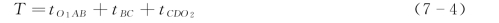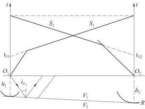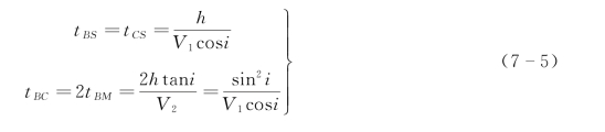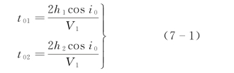 如图7-2所示,设O1、O2分别为两个激发点,得到两条相遇时距曲线S1和S2。当倾斜界面为平面时,S1和S2都为直线段。将S1和S2延长与时间轴分别交于t01和t02,根据时距曲线方程可写出