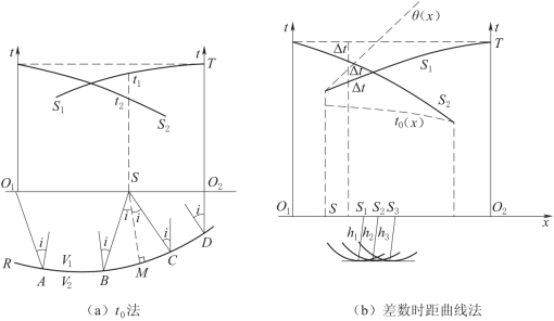 图7-3 t0法和差数时距曲线法示意图