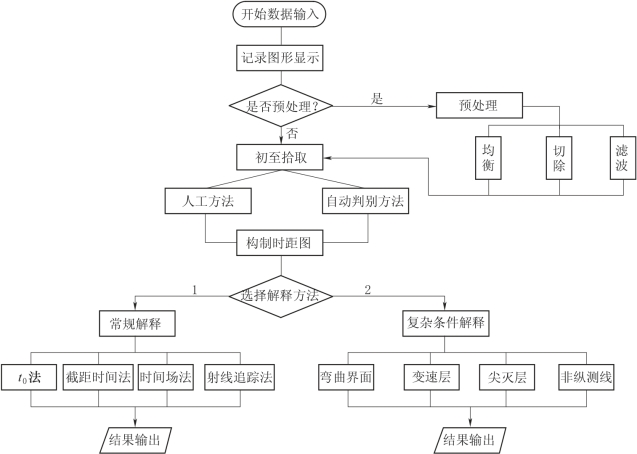 在解释方法选择中,可选常规解释方法和复杂条件解释方法两类。各类中又分别包含有各种不同的方法和不同的情况。通常当折射界面为正常的水平界面或倾斜速度界面时,可选用常规的解释方法;若是其他一些特殊形态的地质体和岩层,则应选用相应的复杂条件解释方法进行解释。