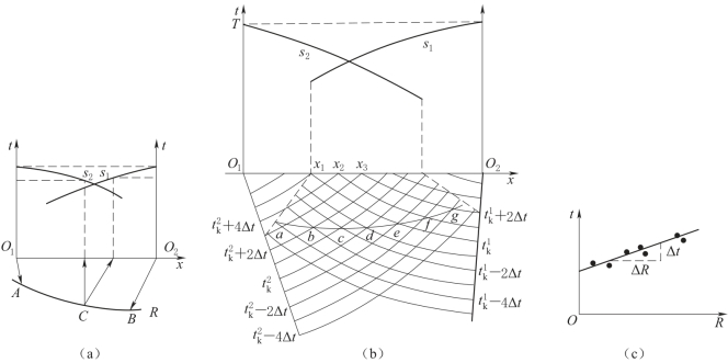 即先在时距曲线上任一点S处,先量得Δt=T-t2,然后在另一条时距曲线上减去Δt而得到t0,各观测点所得t0均不同,可连成t0(x)曲线,如图7-3(b)所示。