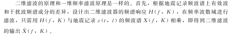 二维滤波可以在频率一波数域进行,也可以在时间一空间域进行,因此,二维滤波要涉及两个自变量(t,l)或(f,K),表示波数。它的数学基础是二维傅里叶变换和二维褶积运算。