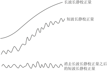 (1)剩余静校正量的分类。剩余静校正量可分为短波长(高频)静校正量和长波长(低频)静校正量两类(图7-19)。其中短波长静校正量是局部范围低速带变化引起的,使共深度点道集中各道反射波到达时间不同,从而影响叠加效果。长波长静校正是较大区域的低速带异常,是由相当于一个排列以上的低速带变化引起的,一般对共深度点道集的水平叠加影响不很大,但这种长波长静校正量的存在将造成速度谱异常,往往容易误认为岩性变化或构造异常引起,导致解释错误。