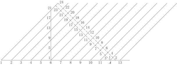 3)在多次覆盖观测系统中,同一个地面接收位置,对于不同地点放炮进行多次的观测,如图7-20所示是六次覆盖观测系统,地面接收点A,用于重复观测12次,这时接收点的静校正量τR不变,而各炮点的静校正量不同。由于这12道记录分属不同炮记录,但它们的接收点相同(都在A点),所以我们称这些道集为共接收点道集。它们分别是:
