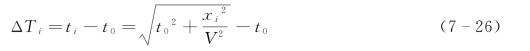 下面讨论动校正量怎样计算、动校正量有什么特点。设有一共深度点时距曲线(图7-15),时距曲线上某点的时间ti由下式确定: