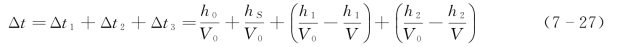 (3)低速带校正。由于低速带的存在,使得接收到的时间延迟了Δt3,更重要的是当低速带的速度和厚度沿测线变化时,各接收点延迟时间将不均匀。一般低速度带的速度很低,为800~1000m/s,基岩速度一般超过2000m/s。为了消除低速带的影响,必须事先测定低速带的速度和厚度及沿测线的变化情况,在校正时,就是把低速层的走时换成高速层基岩的走时。如图7-18所示,低速带校正值为