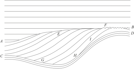 图7-43是根据地震剖面解释出的地震层序剖面,图的中间部分代表一个地震层序,AB和CD是这个层序的顶界和底界。在地震层序内部,各地层之间都是互相整合的连续沉积。在地震层序的顶部和底部,都有三种接触关系。顶部界面AB,在A处为整合,E处是顶超,F处是侵蚀。底界面CD,在G处是上超,H处是下超,I处为整合。