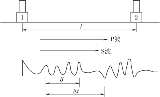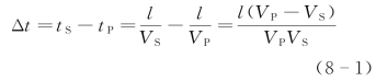 为了识别在记录中的纵横波,可以增加横波的能量和抑制纵波的延续度,并适当增大发射换能器到接收换能器之间的距离l,如图8-5所示。只要纵波初至tP与横波初至tS之间间隔Δt大于纵波延续时间δt,即Δt>δt时,纵波与横波就可以分开。由图8-5可知: