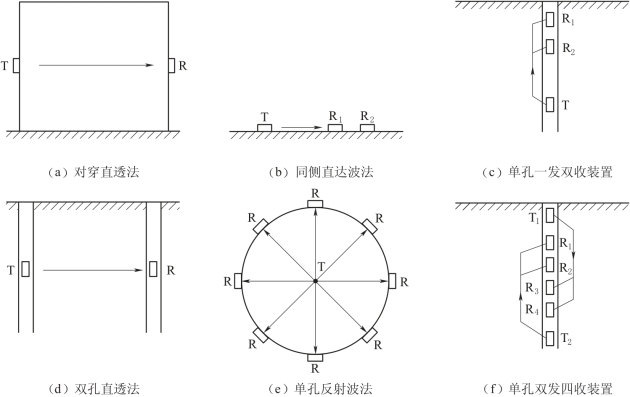 目前,主要是利用纵波进行波速测定,最常用的有直达波法(或直透法)、单孔初至折射波法和反射波法,如图8-3所示。图8-3(a)中的对穿直透法是将发射和接收探头放置目标体的两侧,记录直达波。图8-3(b)为同侧直达波法,是将发射和接收(两个)探头放置目标体表面,记录两个直达波的旅行时间差,可以提高探测结果的横向分辨率和消除目标体表面不规则的影响。图8-3(d)中的双孔直透法需要将发射和接收探头分别放置在两个井孔中。图8-3(c)和图8-3(f)分别为单孔一发双收和单孔双发四收装置,测量纵波临界入射的滑行波,可以获得沿井孔剖面的纵波波速,采用多发射或多接收探头记录时间差,可以消除井轴偏离垂直方向和井壁不规则的影响。图8-3(e)为单孔反射波法,可以是图中的单发射多接收,也可以使用旋转式自激自收探头,能够获得井壁360°的信息。此外,反射波法目前仅用于井中超声电视测井和水上的水声勘探。