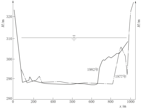 某水库建成后,设置淤积测量大断面18个,于1966年、1968年、1969年、1971年、1972年和1977年先后进行了六次常规淤积测量。每次用常规方法测量均耗费大量人力、物力和时间。1982年11月在水库采用SP-3型地层剖面仪测试近坝体的十条断面,总长40km,而工时仅十余天,测试成果如图8-9所示。纵观十条断面淤积情况,在水库中心附近,都有不同程度的明显淤积。