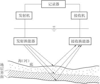 水声探测的工作原理如图8-8所示,工作时发射机人工发射声脉冲(即声波),波向下传播,遇到具有不同波阻抗的分界面时,就会产生反射,接收机接收反射回来的微弱信号,经声-电转换放大后记录下来。