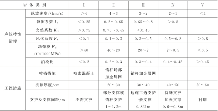 目前对岩体进行工程地质分类的声学参数,主要是纵波波速VP,和由此计算得到的裂隙系数Ls、完整性系数Kv和风化系数Fn等参数。在此基础上,根据多种判据综合形成岩体的工程地质分类方法。表8-2给出的综合评价方法是比较全面和可靠的。上述各种参数分别是这样定义的: