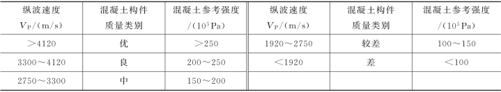 不少工程结构框架是由混凝土构成,因而混凝土浇灌质量的检测是现代工程施工质量检测的关键问题之一。影响混凝土质量的因素主要有混凝土龄期、水灰比、水泥型号等,而这些因素又与声波速度有关,在实际判定时,表8-3所列的数据可供参考。该表是在第二届国际应力波桩基应用会议上推荐的。