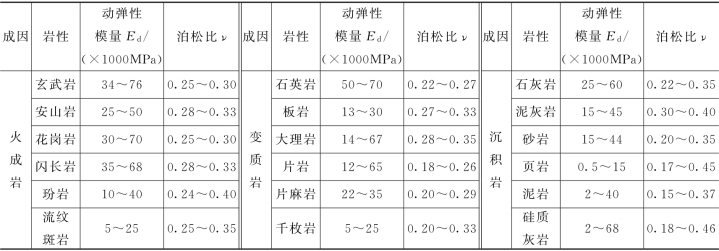 在实际工作时,先用声波仪测出待测的围岩纵波速度VP及横波速度VS,然后可计算出动弹性模量。用声波仪确定弹性模量诸参数,简便易行,省时省力,并能够便于现场大量布置测点,为有限单元法的计算创造必要条件。常见岩石的动弹性模量见表8-1。