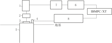 1—电磁激振器;2—力传感器;3—圆形薄钢板;4—拾振器;5—桩头;6—信号发生器;7—功率放大器;8—测振放大器