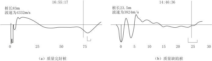 应用时,可以根据已知桩长的理论值L和实测Δf计算Vc值。若Vc小于正常混凝土的波速,说明混凝土的质量差。另外,还可以利用Δf和正常混凝土的Vc值反算桩长的计算值Lm,若Lm小于L,则反映在深度Lm处有质量问题。