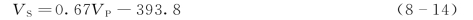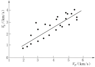 建立纵横波速度的对应关系是横波速度应用的重要一环。从白云工程两阶段声测纵横波速度资料分析可知,当纵横波速度比为1.5~2.5时,纵波速度和横波速度有良好的线性关系,反映在VPVS相关图上,各点密集成带,如图8-15所示。根据横波速度值进行一元线性回归(r=0.89),得到白云坝址跳马涧组砂岩、石英砂岩工程岩体纵横波速度关系式: