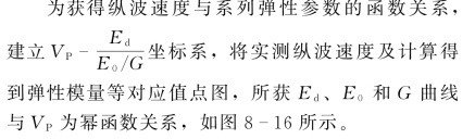 在建立了式(8-14)以后,从实测岩体纵波速度便可计算得到岩体动弹性系列参数,从而可求得纵波速度与系列弹性参数的关系。