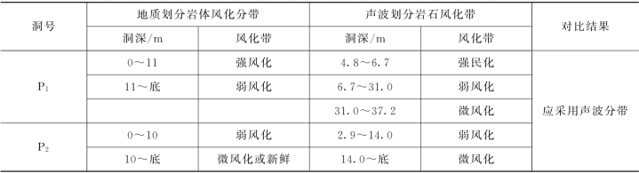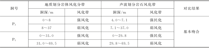 根据上述波速比指标,对白云坝址工程岩体风化分带的验证与修正地质分带结果,用表8-7表示。表8-7为P1~P4平洞地质-声波风化带结果对比。