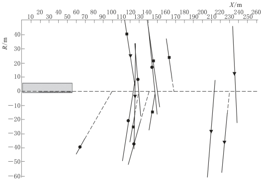 通过相关软件处理TSP超前地质探测结果,按数据设置→带通滤波→初至拾取→拾取处理→炮能量均衡→Q-估计→反射波提取→P-S波分离→速度分析→深度偏移→提取反射层的步骤进行数据处理,可以获得P波、SH波、SV波的时间剖面、深度偏移剖面、提取的反射层、岩石物理力学参数、各反射层能量大小等成果,以及反射层在探测范围内的空间分布。TSP处理成果的动力学特征解释遵循下述原则: