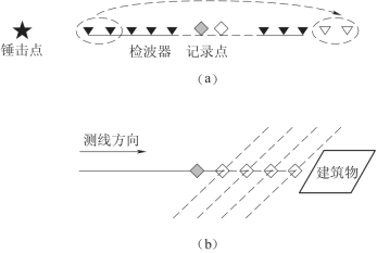 瞬态法的有效波和干扰波不易区别,应该在同一震源位置重复测试数次进行叠加,以便达到增强有效信号、压制干扰的目的。目前,面波勘探可以采用多道接收,如图8-35所示。通常,面波数据现场采集采用图8-35(a)的布置形式;如果沿测线方向遇有建筑物时,按垂直测线的方向布置地震剖面[图8-35(b)]。
