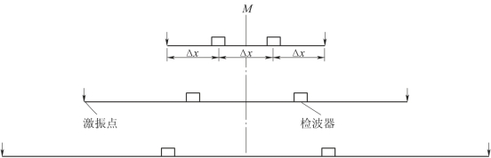 在瞬态法中,为了保证每次激振时各频率成分的信号有足够大的相位差和考虑到地层可能的非水平条件,需逐次改变检波器的间距和采用激振点对称布置的方式,见图8-34。频谱分析处理时取对称的两组结果的平均值作为两检波器连线中点处的值。Δx选用2m左右效果较好。Δx太小时体波的能量较强,Δx太大则畸变较严重。