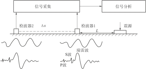 沿波的传播方向,在地表布置距离为Δx的两个检波器1和2(图8-36),如将测得的两条曲线的第一个峰值代表该波的同一个相位,测出它们到达检波器的时差Δt。由同相含义有