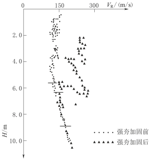 软土、淤泥等软弱地基需要进行加固处理,夯实、挤密、土石置换、复合地基或桩基建造等加固处理后必然导致地基的物理力学性质的变化,波速值改变。因此,在加固前、后的地基上进行面波探测,对比测量结果,可对加固效果作出评价。图8-40为强夯挤密加固前、后在某住宅建筑地基上瑞雷面波勘探的速度-深度资料对比结果。可以发现,在深度6m以上的范围内(加固段),强夯后的波速值增加了近一倍。具体计算结果为,深度为3.7m以上的第一层杂填土中,波速由175m/s增至318m/s;深度为5.9m以上的第二层杂填土中,波速由166m/s增至346m/s。这说明,强夯加固效果非常明显。