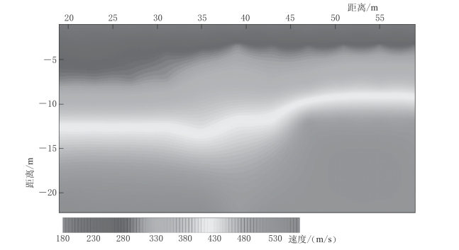 强夯地基的评价工作对工程后期施工至关重要。研究区地处重庆市九龙坡区西部,四面高山环抱,境内丘陵起伏,地貌以丘陵兼低山为主。场地覆盖层为第四系全新统人工素填土和粉质黏土,基岩为侏罗系中统沙溪庙组泥岩、砂岩。图8-38给出了二期1号场地的南向北面波测深映像图,面波反演地层深度在22m左右。其中面波速度范围与西东向测试结果相近,波速在180~600m/s范围内。等波速曲线图总体呈水平层状展布。表层低速区剪切波速值在100~280m/s范围内,埋深为4~8m;中间层波速在380m/s左右,埋深为4~12m,局部地段较厚;底部高速区波速大于450m/s。