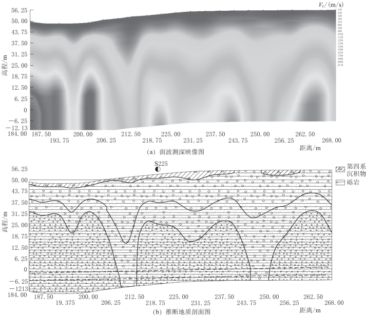 图8-39 岩体的面波测深映像图及推断地质剖面图