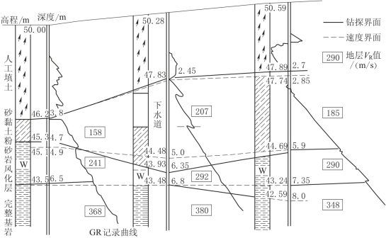 在频点很密的瑞雷面波勘探中,尽管速度曲线与层速度不同,但速度曲线突变处的深度往往对应于介质的界面深度。理论研究和实践均表明,曲线上“之”字形(锯齿状)异常反映了地下弹性介质的分界面。如图8-37所示为三条实测的瑞雷面波速度曲线与地下分界面的关系,可以看出,曲线突变处的深度与地层分界面是吻合的,其解释结果得到了钻孔的验证。
