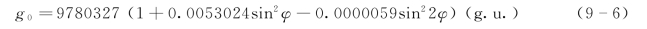 由上述公式可见,要求得到大地水准面上某点的正常重力值,只需将该点的纬度代入式(9-6)即可。对于赤道与两极而言,正常重力值约差5~6伽。