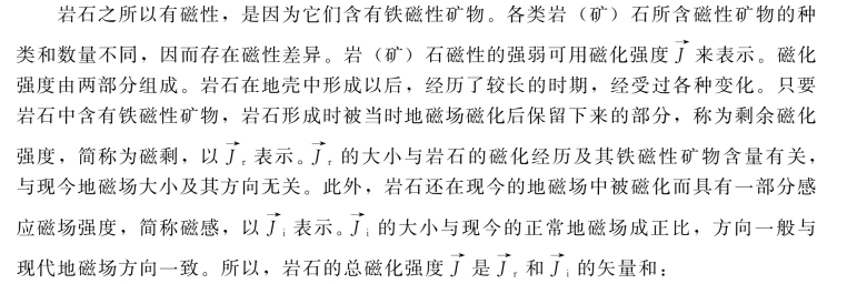 岩(矿)石的磁性除了决定于铁磁性矿物含量和种类外,还决定于岩石的结构、矿物、颗粒大小及岩石形成的物理化学条件。一般来说,岩浆岩磁性最强。由酸性岩到基性岩,铁磁性矿物含量逐渐增加,岩石的磁性也逐渐增强。沉积岩的磁性最弱,变质岩的磁性居中。