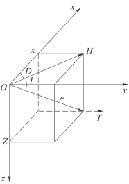 地磁场强度T简称磁场强度,它是一种矢量。在图9-9特定的坐标系中T可以分解为垂直分量Z和水平分量H。H指向磁北,H与T的夹角称为磁倾角I(规定T下倾时I为正值);H与z铀夹角叫作磁偏角,用D表示;并规定H东偏时D为正值。水平分量H又可分解为北分量Hr和东分量Hy。磁场垂直分量Z,磁场水平分量H,磁倾角I及磁偏角D统称为地磁要素,如图9-9所示。