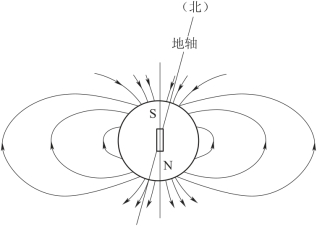 观测表明,地球本体及周围存在着磁场,称为地磁场。通过长期的观测,发现地球磁场的分布是有规律的,它相当于一个磁偶极子的磁场,地球的北部是S极(磁南极),地球的南部是N极(磁北极)。磁轴与地球自转轴并不重合(图9-8)。地球磁力线从磁北极回到磁南极。