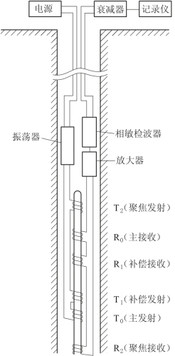井下仪器除发射线圈和接收线圈外,还有振荡器、放大器、检波器。振荡器产生频率稳定、幅度不变的交变信号,并通过发射线圈将其发射出去;放大器将接收线圈所接收到的信号加以放大;相敏检波器将无用信号滤掉,使有用信号通过。