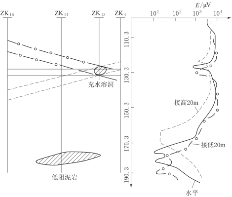 图10-33 应用钻孔电磁波法确定溶洞实例