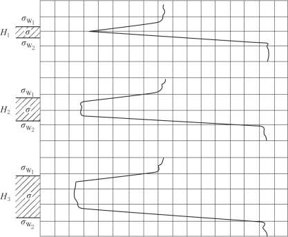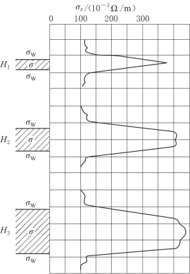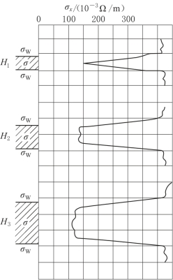 (1)上、下围岩相同的单一电导率岩层。图10-29给出了不同厚度的低电导率岩层所对应的视电导率曲线。低电导率岩层σ=0.1Ω/m,围岩电导率σw=0.5Ω/m,H1=0.6m,H2=1.5m,H3=2.5m。