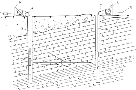 1—发射机;2—接收机;3—滤波器;4—重锤;5—地面控制箱;6—绞车;7—井口滑轮;8—电缆;9—天线