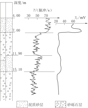 利用岩石密度不同对γ射线吸收的不同,用测得的γ-γ测井曲线的变化来区分岩性。图10-56是利用γ-γ测井曲线划分岩性的一应用实例。对应于泥质砂层,γ-γ测井曲线数值较高,而对应于砂砾石层,γ-γ测井曲线数值较低。在进行γ-γ测井的井孔中,也进行了天然γ测井。同样,对应着泥质地层,自然γ测井测得的γ射线强度较大,砂砾石层γ射线强度较低。